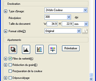 ![]() | Indiquez les paramètres Destination correspondant au fichier image résultant souhaité. |
