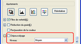 Activez la case à cocher Dépoussiérage (il est possible que vous deviez faire défiler l'écran jusqu'en bas). En Mode loisirs, ouvrez d'abord la boîte de dialogue Ajustements de l'image pour accéder à la case à cocher Dépoussiérage.