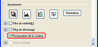 La fonction Restauration des couleurs est une fonction du logiciel du scanner qui restaure les couleurs passées des films et des photos. Pour restaurer les couleurs, activez la case à cocher Restauration des couleurs dans la section Ajustements (il est possible que vous deviez faire défiler l'écran jusqu'en bas). En Mode loisirs, ouvrez d'abord la boîte de dialogue Ajustements de l'image pour accéder à la case à cocher Restauration des couleurs.