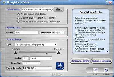 PRINT Image Matching est une méthode standardisée d'enregistrement d'une palette plus large d'informations de couleur afin d'améliorer la qualité de vos images numérisées. En utilisant une imprimante compatible avec PRINT Image Matching, vous pouvez obtenir sans effort des résultats imprimés plus vrais que nature.