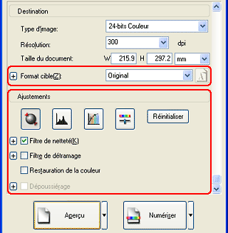 ![]() | Si nécessaire, définissez les paramètres Ajustements (il est possible que vous deviez faire défiler l'écran jusqu'en bas). |