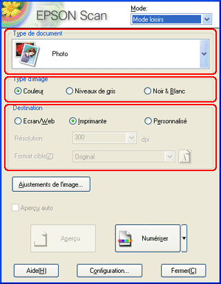 ![]() | Dans la fenêtre principale de EPSON Scan, définissez les paramètres Type de document, Type d'image et Destination. |