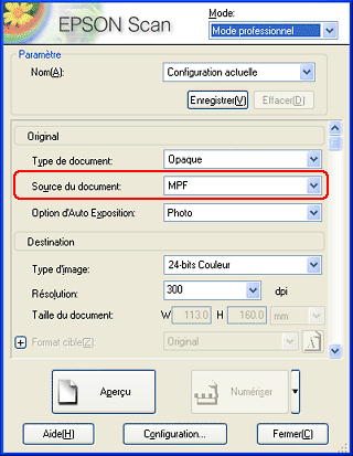 ![]() | Dans la fenêtre principale de EPSON Scan, assurez-vous que l'option CMP est sélectionnée dans la liste Source du document et définissez ensuite les paramètres souhaités pour la numérisation. |