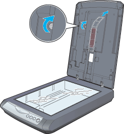 Tout en maintenant le capot, ouvrez le capot d'insertion des films et tournez le bouton d'alimentation vers le bas pour déplacer le film coincé jusqu'à ce que l'extrémité du film soit extraite de la zone de chargement.