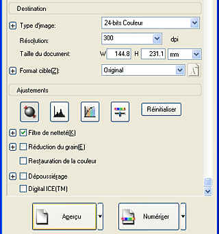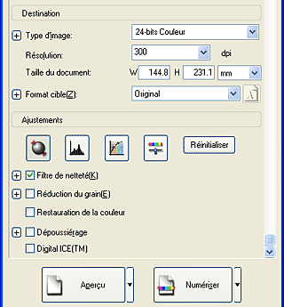 ![]() | Indiquez la taille de sortie de l'image numérisée à l'aide du paramètre Format cible et effectuez si nécessaire des réglages avec les outils d'ajustement de la qualité de l'image (il est possible que vous deviez faire défiler l'écran jusqu'en bas). |