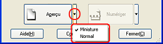 Cliquez sur Aperçu pour lancer la prénumérisation et afficher un aperçu de l'image. Selon le mode et les paramètres Type de document sélectionnés, une petite flèche apparaît à droite du bouton Aperçu pour vous permettre de sélectionner une méthode d'aperçu. Cliquez sur la flèche et sélectionnez Miniature ou Normal pour modifier la méthode d'aperçu.
