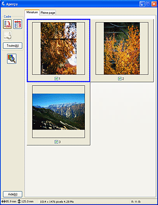 La méthode Aperçu des miniatures vous permet d'afficher un aperçu de plusieurs images sous forme de miniatures. EPSON Scan détecte automatiquement les images de sortie et applique la fonction Exposition automatique à chaque image. Vous pouvez modifier chaque image miniature et effectuer d'autres ajustements sur les images. Vous pouvez aussi utiliser des zones de cadrage pour numériser des portions d'image sélectionnées. Pour plus de détails sur les zones de cadrage, reportez-vous à la section Utilisation de zones de cadrage.