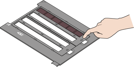 Faites glisser le bord de la bande dans le support de films, bord inférieur orienté vers le bas. Puis, placez la bande de manière à ce que toute la vue soit positionnée à l'intérieur du support de films. Vous pouvez placer jusqu'à 24 vues dans ce support de films.