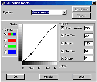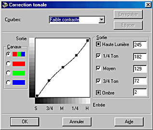 Vous pouvez régler avec précision le contraste d'une image en lui affectant l'une des courbes tonales prédéfinies. Cette fonction, associée aux paramètres Exposition automatique de la fenêtre Mode Manuel, vous permet de contrôler avec précision l'aspect de votre image. La liste Courbes de la boîte de dialogue Correction tonale vous propose les cinq courbes tonales les plus courantes, décrites ci-après.