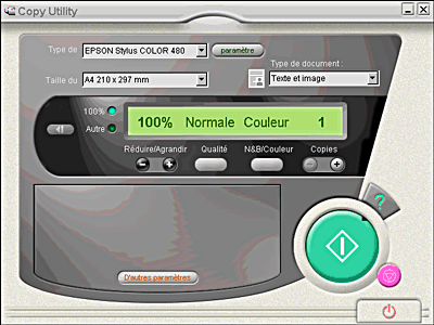 Cette application transforme votre scanner en copieur numérique. L'application reproduit l'aspect d'un véritable copieur, tout en procurant des fonctions beaucoup plus puissantes et souples que celles disponibles sur un copieur conventionnel. Pour plus d'informations, reportez-vous à la documentation de EPSON SMART PANEL.
