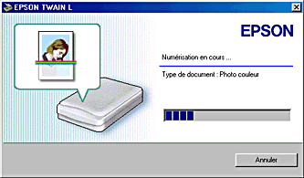![]() | La fenêtre ci-dessous affiche une barre de progression pour indiquer l'avancement du processus de numérisation. Vous pouvez voir le type de document en cours de numérisation. Lors de la numérisation de plusieurs photos, vous pouvez aussi voir le numéro de l'image numérisée. |