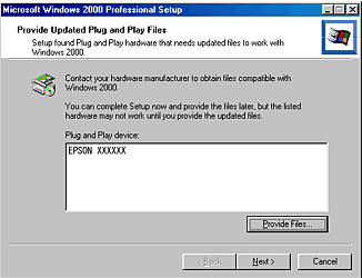 Si, au cours de l'installation de Windows 2000, une boîte de dialogue semblable à celle représentée ci-dessous s'affiche et vous invite à indiquer l'emplacement des fichiers mis à jour pour votre scanner, cliquez sur Suivant et continuez l'installation. Ne cliquez pas sur Fournir les fichiers....