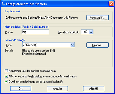 Si vous avez lancé la numérisation en exécutant EPSON Scan en tant que programme autonome, la fenêtre Enregistrer les paramètres s'affiche. Cette fenêtre vous permet de sélectionner le nom et l'emplacement des fichiers de numérisation enregistrés. Pour plus de détails, reportez-vous à la section Sélection des paramètres d'enregistrement des fichiers.