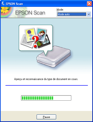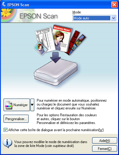 Lors du premier démarrage de EPSON Scan, le Mode automatique est activé et la fenêtre de veille de EPSON Scan s'affiche.