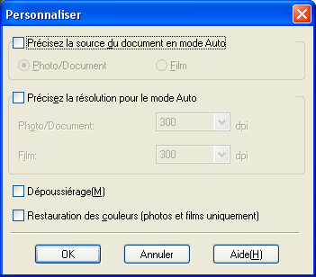 Si vous souhaitez sélectionner une résolution personnalisée, restaurer les couleurs passées ou supprimer les traces de poussière présentes sur le film ou la diapositive, cliquez sur le bouton Personnalisée. La fenêtre Personnalisée apparaît.