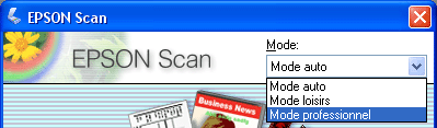 Pour activer un autre mode de numérisation, cliquez sur la flèche de la zone Mode située dans la partie supérieure droite de la fenêtre de EPSON Scan. Sélectionnez ensuite le mode que vous souhaitez utiliser dans la liste qui s'affiche.