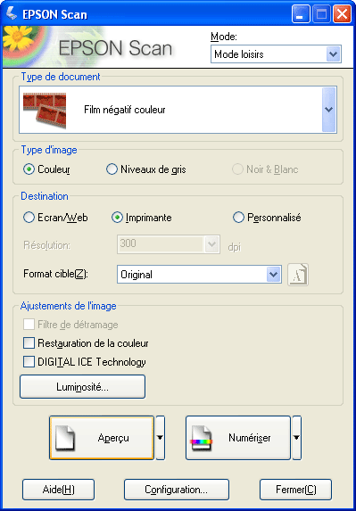 Le Mode loisirs est le plus adapté lorsque vous souhaitez les images des photos, films ou diapositives en aperçu avant de procéder à la numérisation. Vous pouvez modifier la taille de l'image lors de la numérisation, ajuster la zone de numérisation ainsi que de nombreux paramètres de l'image, incluant la restauration de la couleur et la fonction DIGITAL ICE Technology.
