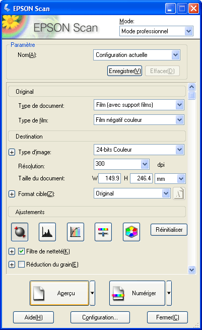 Si le Mode loisirs ou le Mode professionnel est activé, la fenêtre Configuration EPSON Scan s'affiche. Pour plus d'informations sur la procédure à suivre, reportez-vous à la section Sélection des paramètres de base.