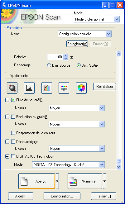 Le Mode professionnel est le plus adapté lorsque vous souhaitez afficher l'image en aperçu et apporter des corrections nombreuses et détaillées au niveau de l'image avant de procéder à la numérisation. Vous pouvez accentuer l'image, corriger les couleurs ou améliorer l'image à l'aide de toute une gamme d'outils, incluant les fonctions Restauration de la couleur, Dépoussiérage, DIGITAL ICE Technology et DIGITAL ICE Lite Technology.