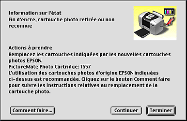 Quand il n'y a presque plus d'encre ou que la cartouche est épuisée, le bouton Comment faire apparaît sous la zone de texte. Cliquez sur Comment faire. L'utilitaire EPSON Status Monitor 3 vous guidera pas à pas tout au long de la procédure de remplacement de la cartouche.
