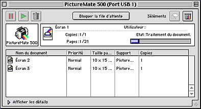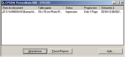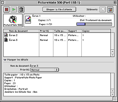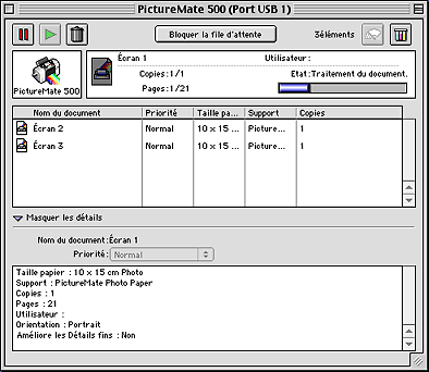 Après l'envoi d'un travail d'impression à l'imprimante, vous pouvez utiliser l'utilitaire EPSON MonitorIV pour vérifier, annuler ou modifier la priorité des travaux d'impression mis en file d'attente. Cet utilitaire montre aussi l'état du travail en cours d'impression.