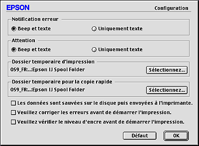 Choisissez la méthode qu'utilisera EPSON StatusMonitor pour vous prévenir en cas d'erreur. |