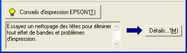 Des conseils pour obtenir les meilleurs résultats de votre logiciel d'impression EPSON s'affichent dans la zone de texte au bas de la fenêtre de la barre de progression. Un nouveau conseil apparaît toutes les 30 secondes. Pour plus de détails sur le conseil affiché, cliquez sur le bouton Détails.