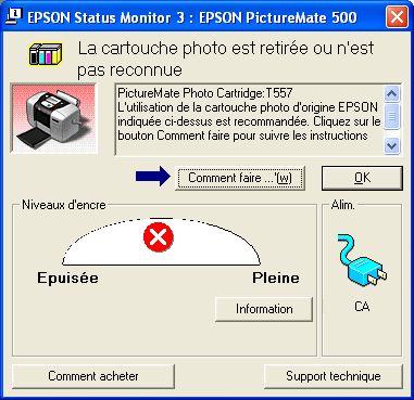 Quand il n'y a presque plus d'encre ou que la cartouche est épuisée, un bouton Comment faire apparaît. Cliquez sur Comment faire. L'utilitaire EPSON StatusMonitor vous guidera pas à pas tout au long de la procédure de remplacement de la cartouche photo.