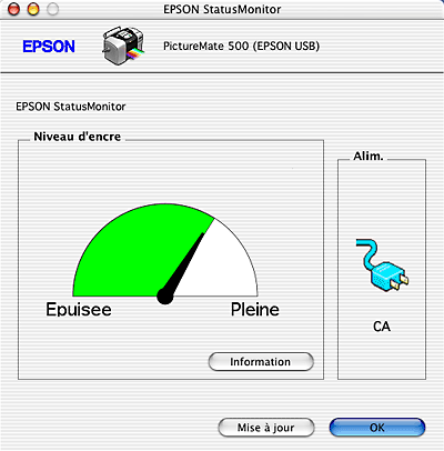 Vous pouvez aussi utiliser StatusMonitor pour vérifier le niveau d'encre et le niveau d'alimentation avant l'impression. EPSON StatusMonitor affiche la quantité d'encre qui restait au moment de son ouverture. Pour mettre à jour les informations relatives au niveau d'encre, cliquez sur Mise à jour. Lorsque vous utilisez l'imprimante avec une batterie en option, vous pouvez vérifier la quantité d'énergie restante dans la batterie.
