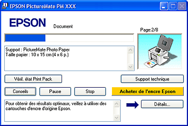 ConseilsDes conseils pour obtenir les meilleurs résultats de votre pilote d’impression Epson s’affichent dans la zone de texte au bas de la fenêtre de la barre de progression. Pour plus de détails sur le conseil affiché, cliquez sur le bouton Détails.