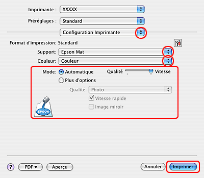 Sélectionnez les paramètres Support, Couleur et Mode adaptés. Pour plus de détails sur l’option Configuration Imprimante, reportez-vous à l’aide en ligne.