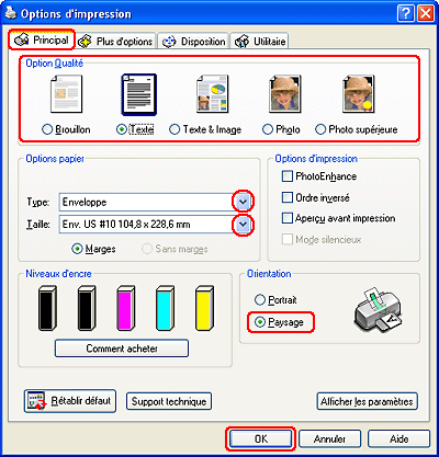 Sélectionnez Enveloppe pour le paramètre Support et sélectionnez les paramètres Couleur et Mode adaptés. Pour plus de détails sur l’option Configuration Imprimante, reportez-vous à l’aide en ligne.