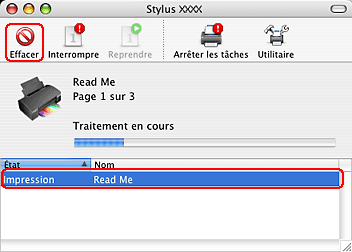 Quand un travail d'impression atteint le début de la file d'attente, l'utilitaire EPSON Spool Manager lance l'impression de ce travail. Il est possible d’annuler des travaux d’impression à partir de l’utilitaire Spool Manager. Vous pouvez également afficher des informations relatives à l'état des travaux d'impression et interrompre, reprendre ou redémarrer l'impression.