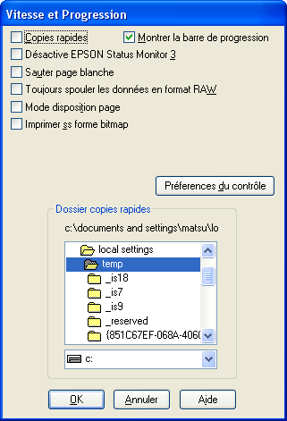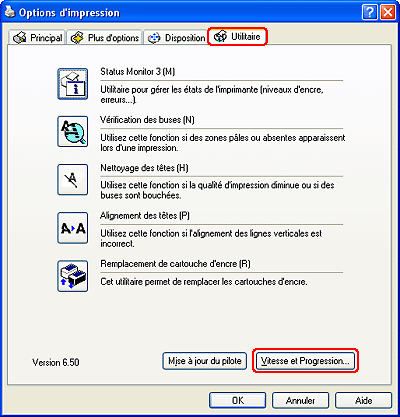 Vous pouvez augmenter la vitesse d'impression en sélectionnant certains paramètres de la fenêtre Vitesse & Progression. Cliquez sur le bouton Vitesse & Progression de la fenêtre Maintenance du pilote d'impression.