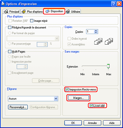Cliquez sur l’onglet Disposition, puis activez la case à cocher Impression Recto-verso.