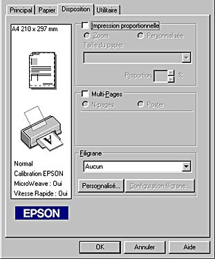 ![]() | Sous Windows, sélectionnez le filigrane souhaité dans la liste Filigrane du menu Disposition, et cliquez sur le bouton Paramètres. |