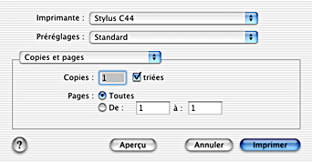 Vous pouvez régler les paramètres Support, Mode, Encre, Copies et Pages dans la zone de dialogue Imprimer. Cette zone de dialogue vous permet d'avoir un aperçu du document avant de l'imprimer. Reportez-vous à la section appropriée ci-dessous.
