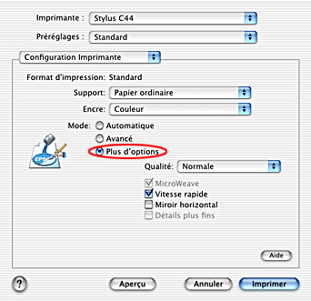 Ce mode permet de procéder à des réglages d'impression plus détaillés. Pour plus de détails, reportez-vous à la section Utilisation du mode Plus d'options. |