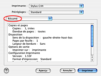 Lorsque l'option Résumé est sélectionnée dans la zone de dialogue Imprimer, vous pouvez vérifier les réglages en cours de cette zone de dialogue.