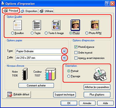 Cliquez sur l'onglet Principal et définissez ensuite les paramètres Option qualité. Pour plus de détails sur les paramètres Option qualité, reportez-vous à la section suivante.