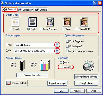 Le paramètre Economie proposé dans la zone Options papier & qualité du menu avancé n'est pas disponible lors de l'impression sur des enveloppes.
