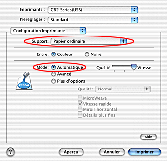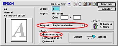 Sélectionnez Papier ordinaire dans la zone Support, et Automatique dans la zone Mode.