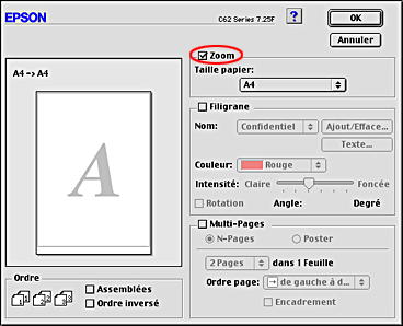 La fonction Zoom permet d'imprimer un document de telle façon qu'il convienne au format de papier sélectionné dans la liste Taille du menu Papier.