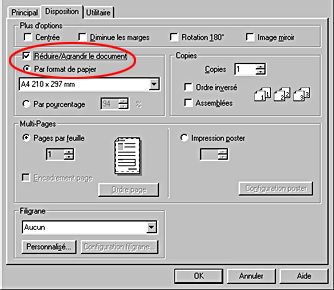Dans le menu Disposition (Windows), cochez la case Réduire/Agrandir le document et sélectionnez Par format de papier.