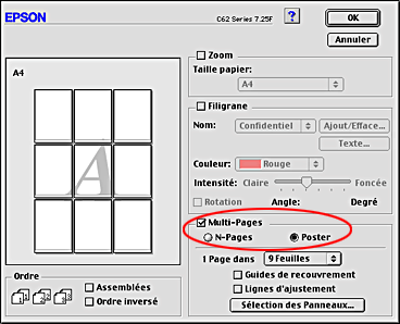 Sélectionnez l'option Impression poster dans le cadre Multi-Pages du menu Disposition, puis cliquez sur la flèche vers le haut ou vers le bas pour sélectionner 2 x 2, 3 x 3 ou 4 x 4.