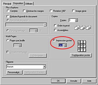 Pour définir le mode d'impression du poster, cliquez sur le bouton Configuration poster. La boîte de dialogue Configuration du poster s'ouvre.