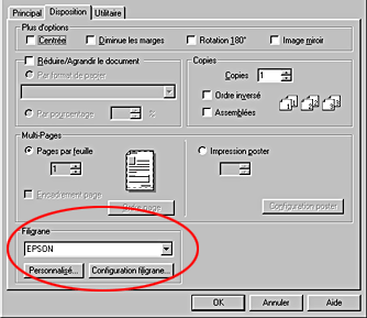 ![]() | Sous Windows, sélectionnez le filigrane souhaité dans la liste Filigrane du menu Disposition, et cliquez sur Configuration filigrane. |