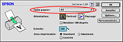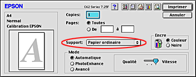 Sous Macintosh, sélectionnez le support approprié dans le dialogue Imprimer, puis sélectionnez le format de papier dans le dialogue Format d'impression.