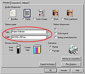 Sous Windows, sélectionnez la taille et le type de papier approprié dans le cadre Options papier du menu Principal.