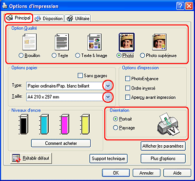 Pour modifier l'orientation du tirage, sélectionnez Portrait (vertical) ou Paysage (horizontal).